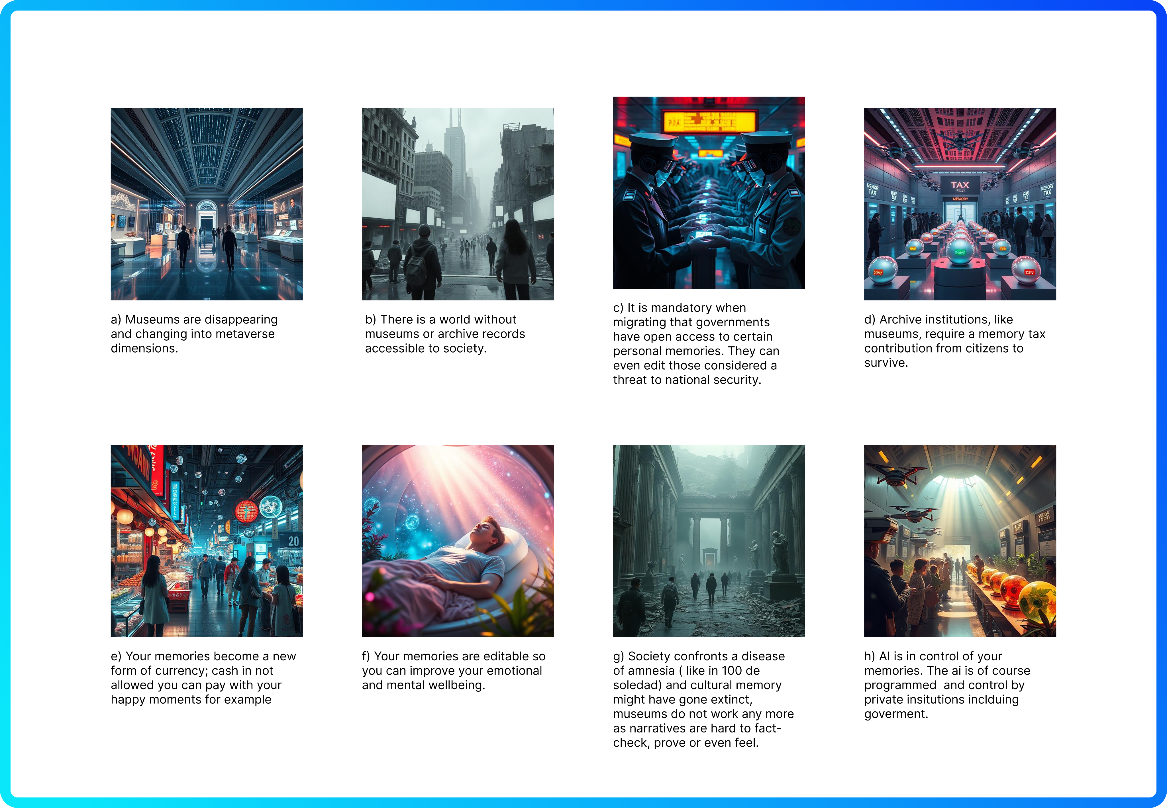 Society can no longer distinguish between real and fabricated memories.Narratives fade. Archives are glitchy. Elders are ignored. Society start losing access to their cultural roots — not by force, but by forgetting. society forgets how to remember. Museums become useless — narratives can’t be verified or felt.