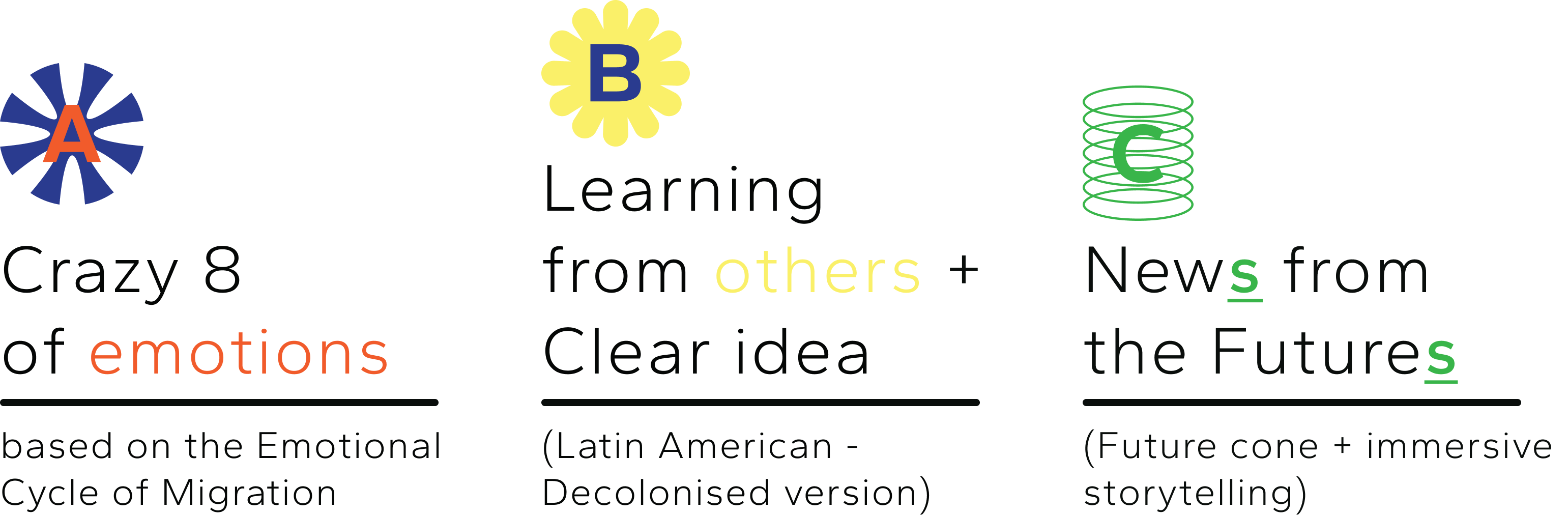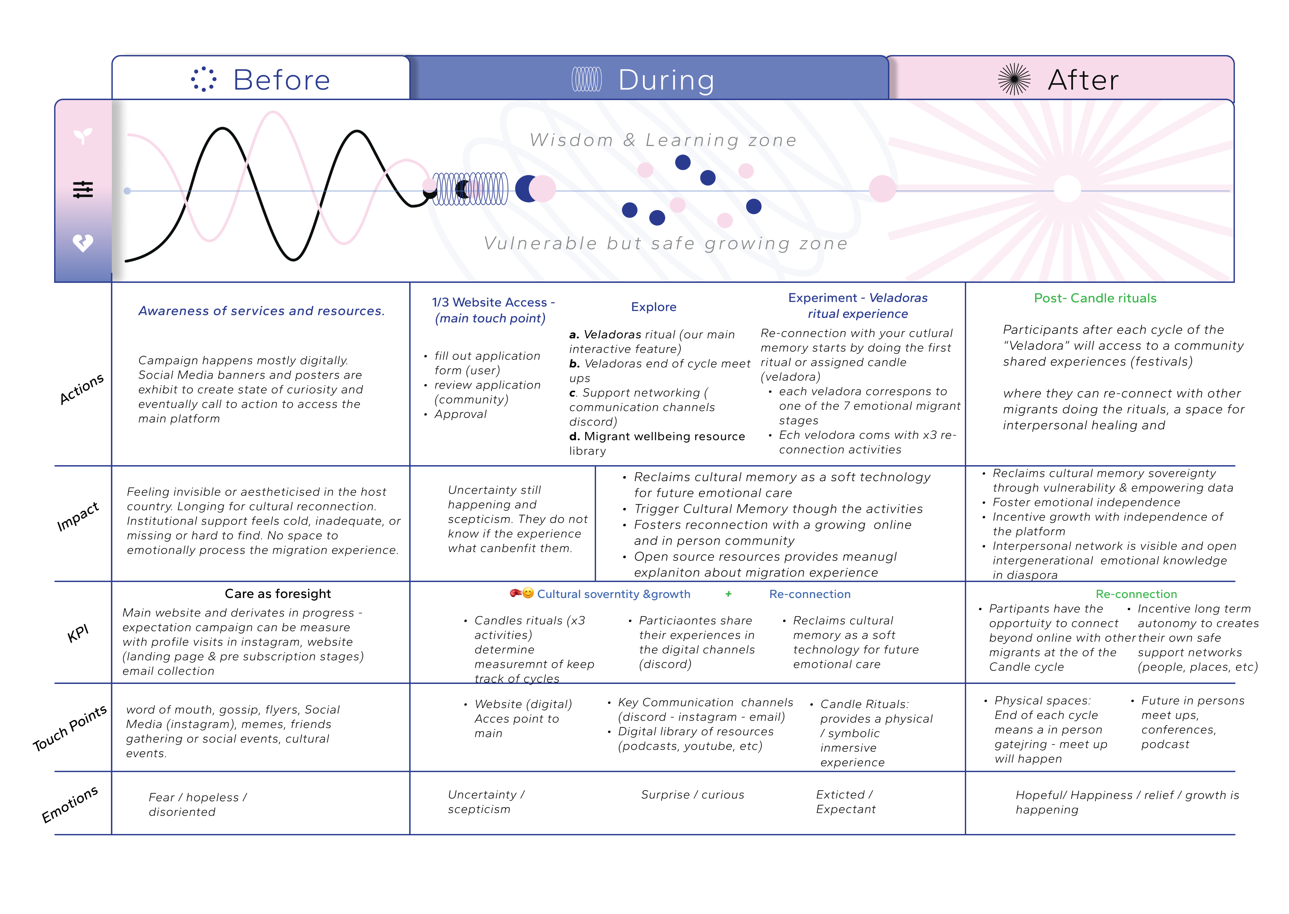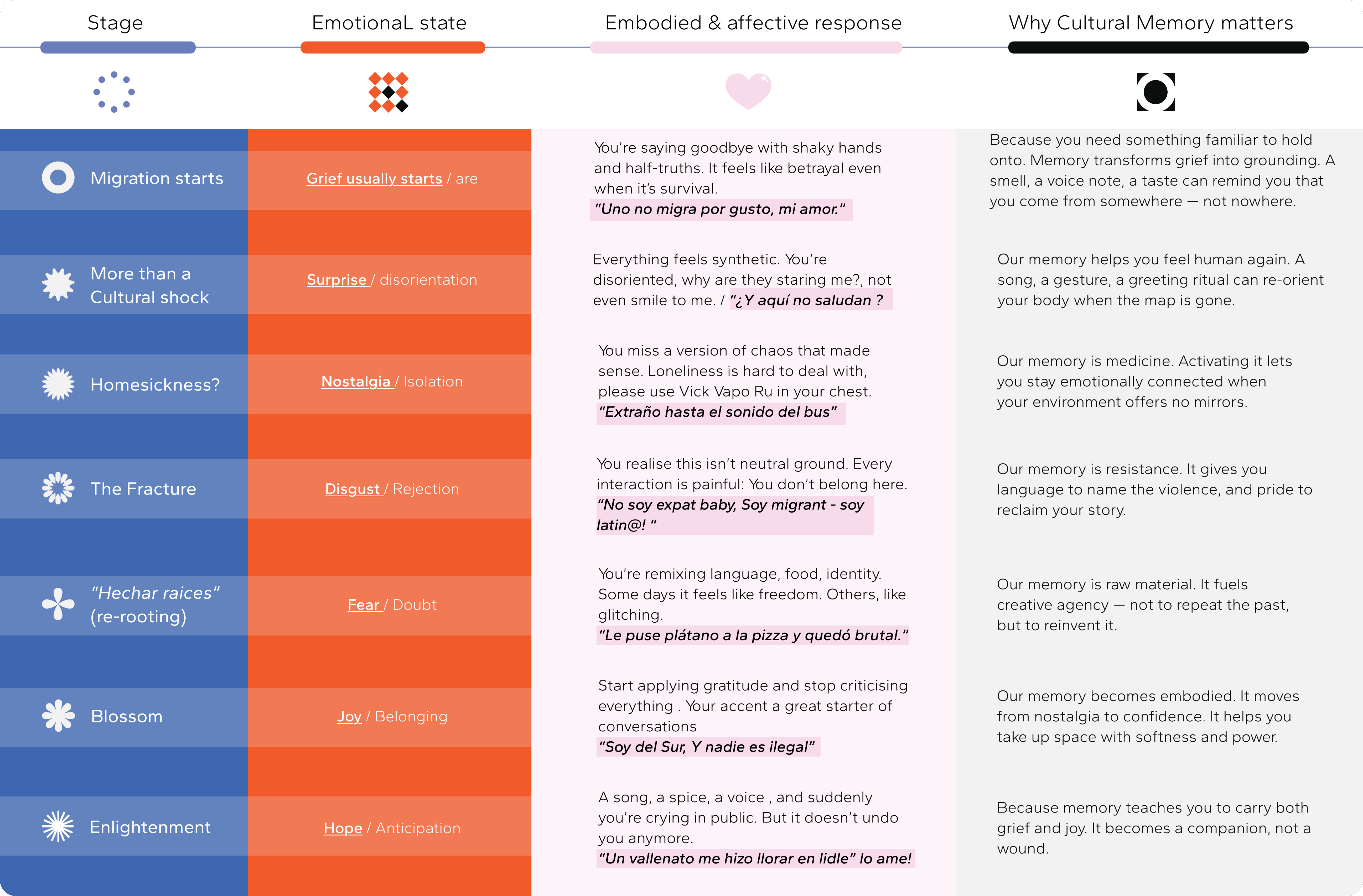 Each “Veladora” correspond to one emotional stage of the migration journey map. These candles includes x3 ritual activities designed to evoke cultural memory and interpersonal care (eventually leading towards supporting wellbeing)