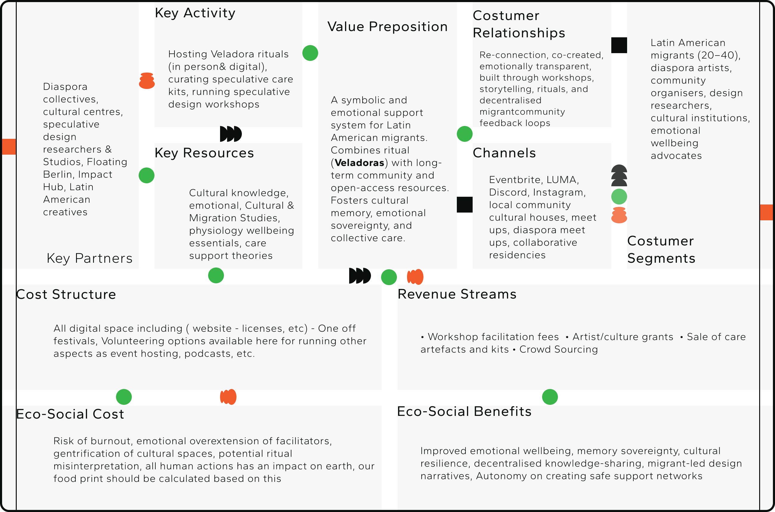 To envision this path, I used the Sustainable Business Model Canvas as a framework to ground the project’s future viability. It allowed me to map the values, relationships, and resources needed, while creating a realistic vision for this stage of my professional journey.