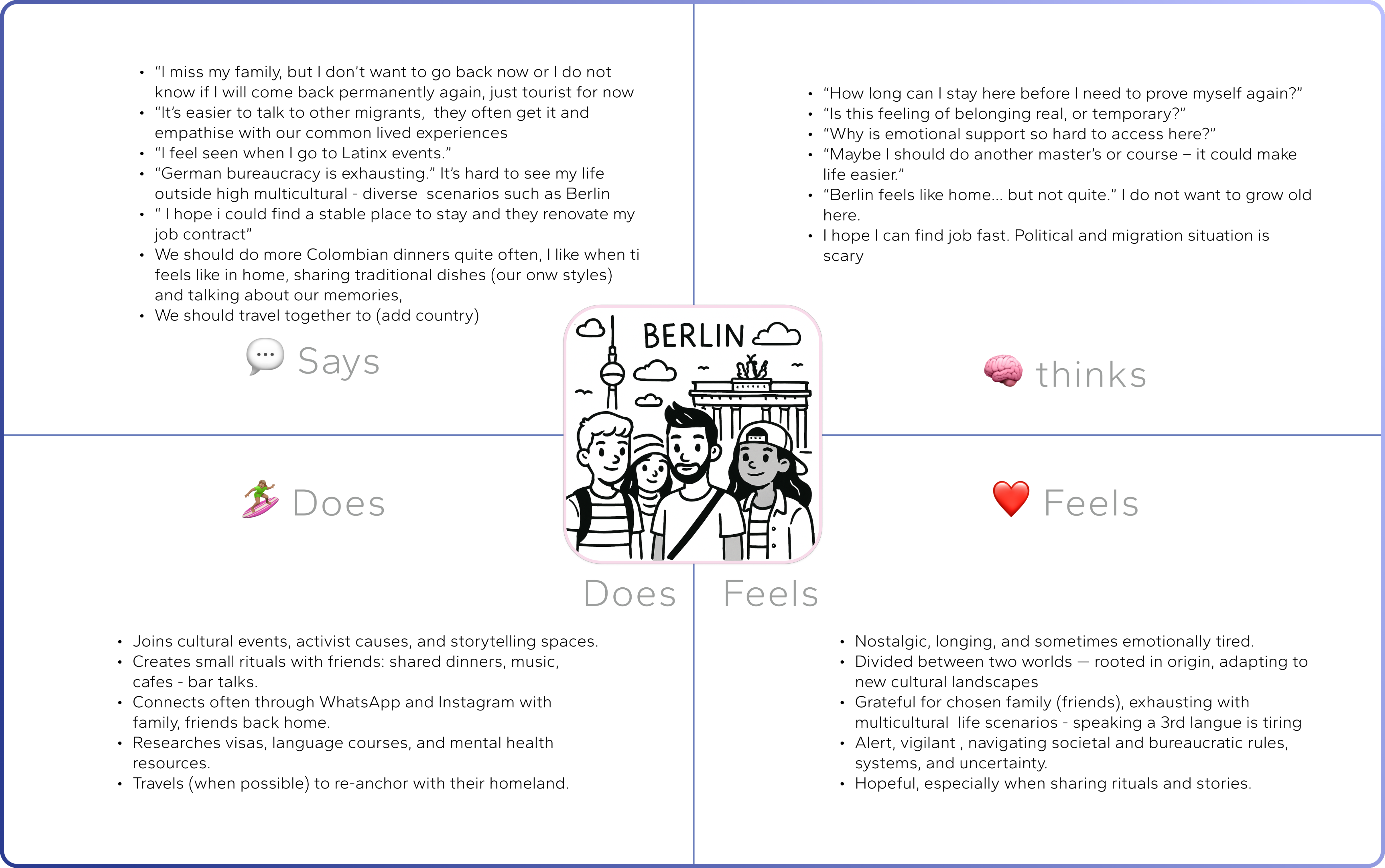 I decided to move from individual personas to community personas because the experiences I was studying were not isolated but collective. Migration, memory, and belonging are shaped by shared emotions, rituals, and social networks. The community persona allowed me to represent these interdependent dynamics — not a single user, but a living ecosystem of voices, needs, and memories influencing each other.